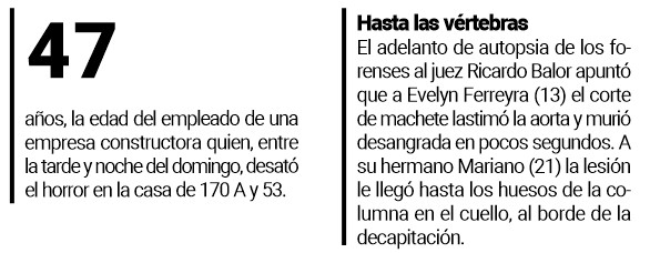Otras voces judiciales y policiales contactadas por este Diario agregaron que, con las observaciones y primeros cotejos a los rastros de sangre en la vivienda de la masacre, estimaron que el ataque habría sido cometido entre doce y quince horas antes de que la policía descubriera el hecho el lunes a las 7.30 y a instancia de un familiar (hermana de José Ferreyra) que se preocupó por la ausencia de señales de vida en el lugar.