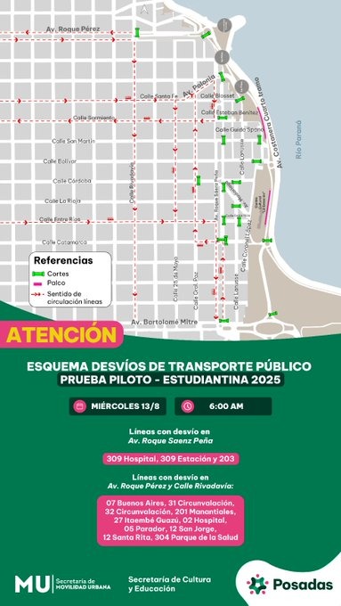 En cuanto al transporte público, las líneas con desvío en avenida Roque Sáenz Peña son: 309 Hospital, 309 Estación y 203. Mientras que tendrán desvío en avenida Roque Pérez y calle Rivadavia las líneas: 07 Buenos Aires, 31 Circunvalación, 32 Circunvalación, 201 Manantiales, 27 Itaembé Guazú, 09 Hospital, 05 Parador, 12 San Jorge, 12 Santa Rita, 304 Parque de la Salud.