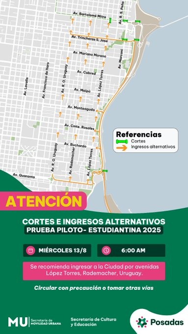 El esquema de cortes viales dispuesto por la Secretaría de Movilidad Urbana y la Secretaría de Cultura y Educación de Posadas comprende cierres en varias avenidas que desembocan en la costanera, desde Bartolomé Mitre hasta la avenida Roque Pérez, con ingresos alternativos por López Torres, Rademacher y Uruguay. Se solicita a los conductores circular con precaución o tomar otras vías.