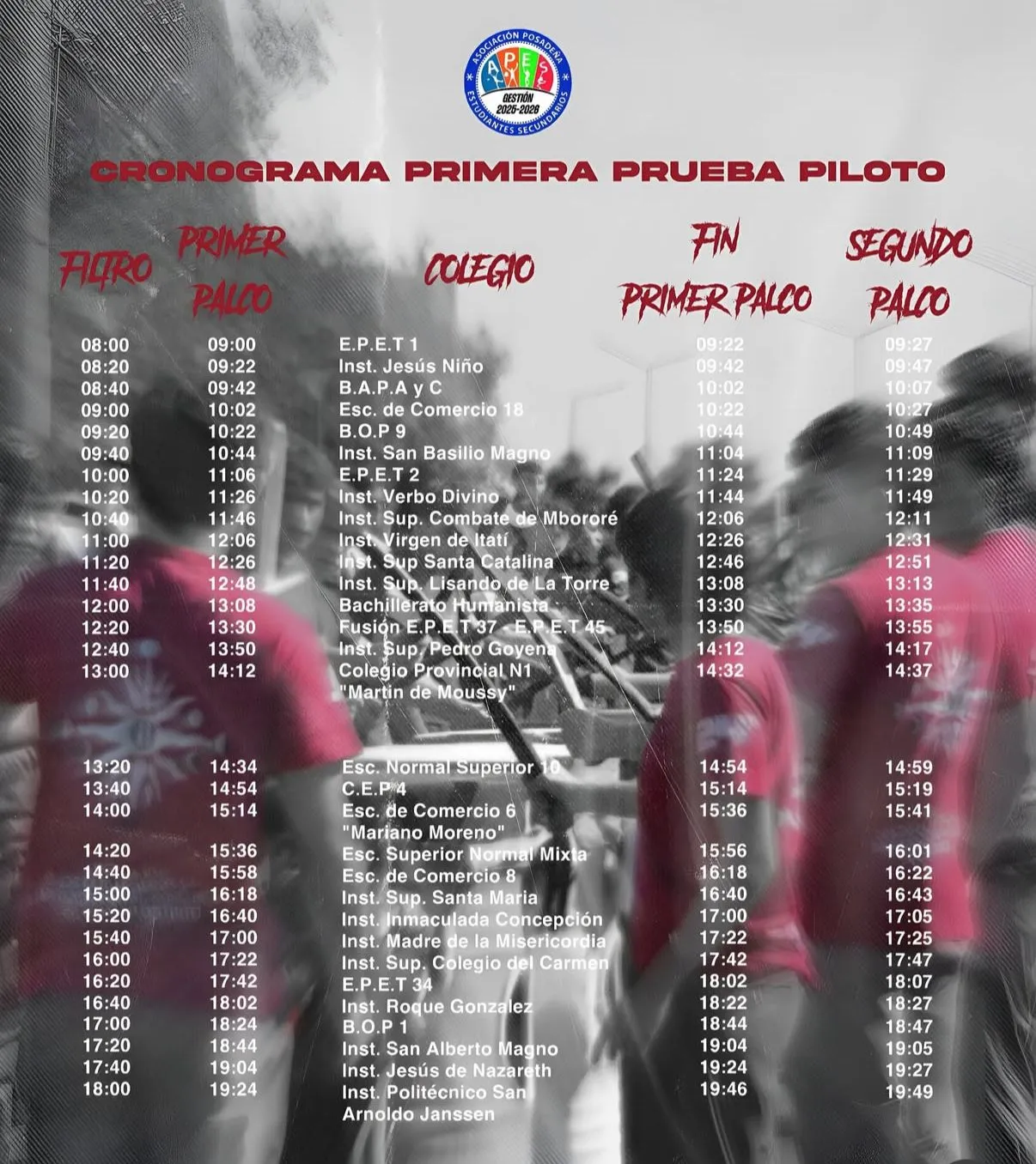 Las delegaciones desfilan frente a dos palcos oficiales, donde se cronometran los tiempos de paso de cada institución y se verifica el funcionamiento del dispositivo organizativo. La apertura estuvo a cargo de la EPET N°1, vigente campeona tras consagrarse en 2024. La jornada también sirve para revisar las condiciones del recorrido y analizar la operatividad de los equipos de control y asistencia.