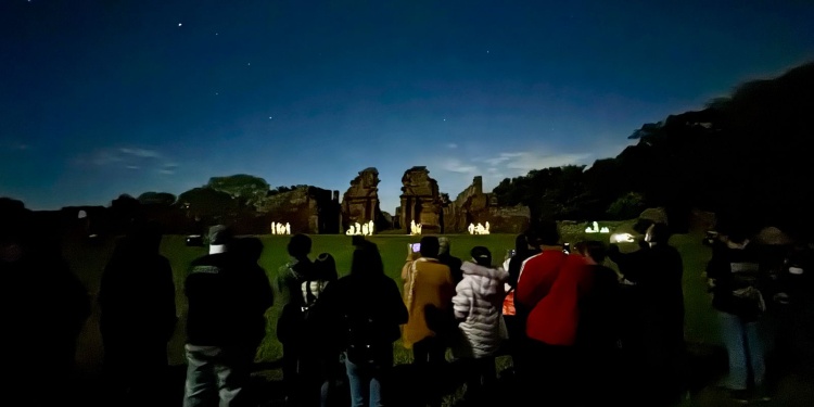 La propuesta combina historia, arte y tecnología para recrear el legado jesuítico-guaraní en un recorrido nocturno. Las proyecciones audiovisuales sobre los muros del sitio narran, durante 45 minutos, el encuentro entre la cultura guaraní y la jesuítica, guiados por el relato de un cacique.