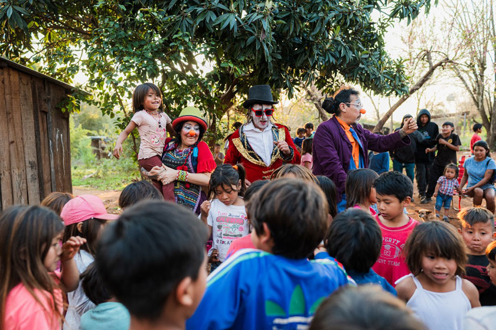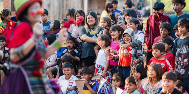 En la jornada inaugural, realizada en la aldea Okara, los Reciclocirco y el payaso Pochosky compartieron cuentos, malabares e integración con la comunidad, concluyendo con una merienda colectiva.