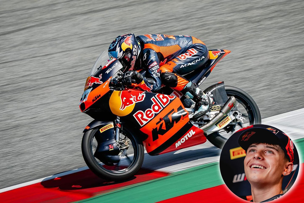 Con un tiempo de 1:39.938, el joven piloto se quedó con el mejor registro de la clasificación oficial en el circuito Red Bull de la ciudad austríaca de Spielberg. El argentino superó al español Ángel Piqueras y al japonés Ryusei Yamanaka, ambos de KTM.