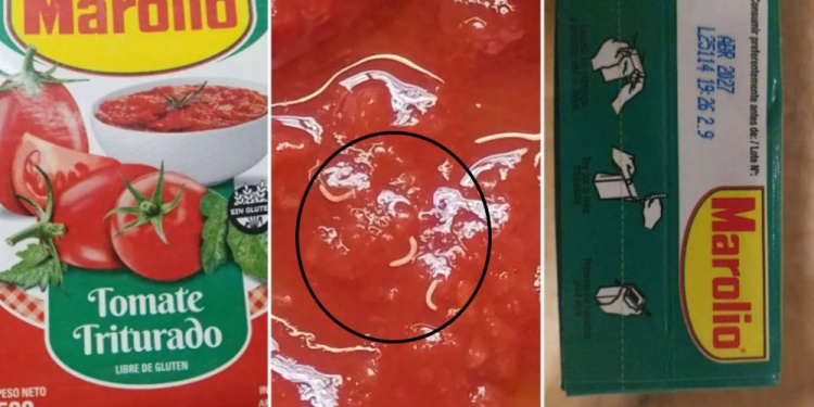 Familias que recibieron el producto a través de la entrega escolar informaron sobre la presencia visible de estos organismos en el siguiente lote: “Tomate triturado, libre de gluten, marca Marolio, peso neto 500g, RNPA N° 13-061695, Lote L25114 con vencimiento en abril de 2027, elaborado por MAROLIO SA en Empedrado 2571, Ciudad Autónoma de Buenos Aires, RNE N° 13010369, producto de Mendoza”.