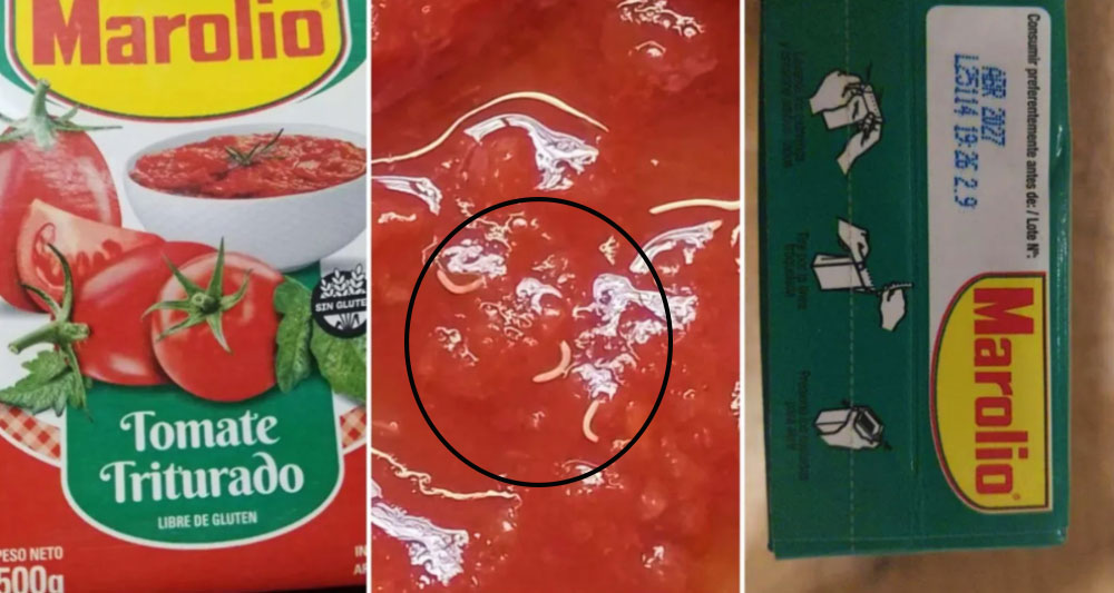 Familias que recibieron el producto a través de la entrega escolar informaron sobre la presencia visible de estos organismos en el siguiente lote: “Tomate triturado, libre de gluten, marca Marolio, peso neto 500g, RNPA N° 13-061695, Lote L25114 con vencimiento en abril de 2027, elaborado por MAROLIO SA en Empedrado 2571, Ciudad Autónoma de Buenos Aires, RNE N° 13010369, producto de Mendoza”.