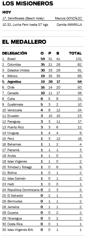 Por otra parte, hoy hará su presentación la última competidora misionera. Camila Amarilla tendrá su debut en la categoría 57kg en lucha. Se enfrentará a la cubana Yaynelis Sanz desde las 10.32 en cuartos de final. En caso de avanzar, disputará semifinales también hoy, desde las 11.52 ante la ganadora del cruce entre la puertorriqueña Eliana White-Vega y la guatemalteca Allison Valdez.