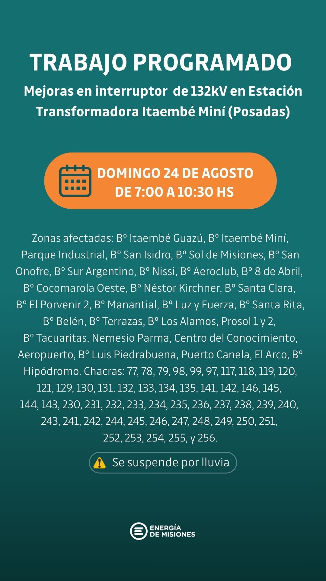 La empresa Energía de Misiones anunció que este domingo 24 de agosto se realizarán trabajos programados en la Estación Transformadora Itaembé Miní de Posadas, lo que implicará cortes de energía en un amplio sector de la ciudad.