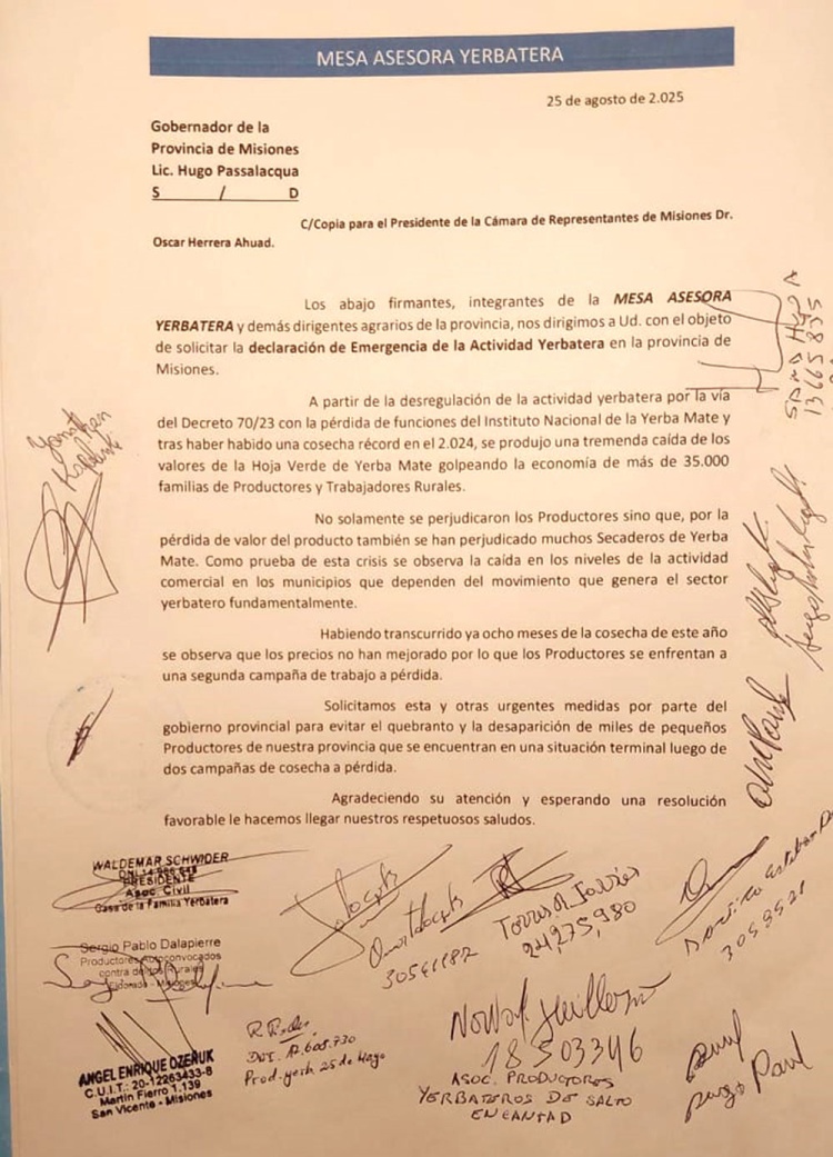 La nota lleva las firmas de referentes de la Asociación Civil Casa de la Familia Yerbatera, Productores Autoconvocados de San Pedro, Asociación de Productores de San Vicente, Asociación de Productores Yerbateros de Salto Encantado, además de otras asociaciones y productores de distintos municipios.