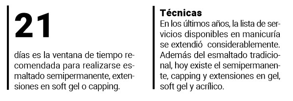 En manicuría, Ríos puntualizó que las técnicas más demandadas hoy son esmaltado semipermanente, extensiones en soft gel y capping. “Las extensiones en soft es lo más demandado, principalmente porque deja la uña con un acabado natural, la protege y no hay que lidiar, por ejemplo, con un producto complicado para nivelar y pulir”, explicó Ríos.