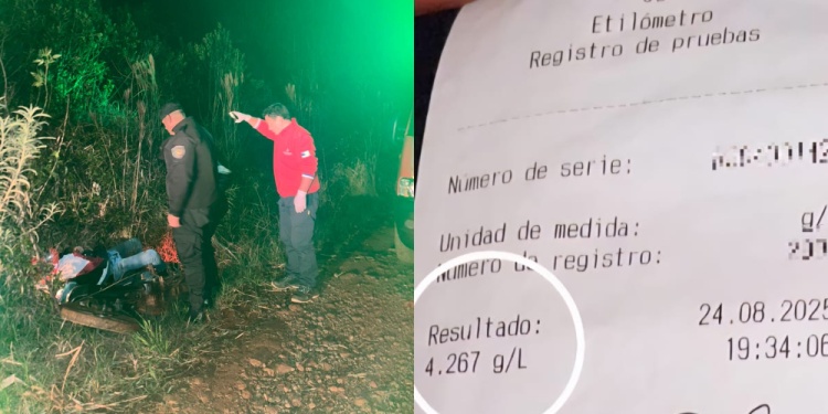 Esta vez, un motociclista imprudente tuvo la “suerte” de no provocar un hecho grave en Apóstoles debido a que estaba muy ebrio para conducir, por ende, despistó, se cayó de la moto y quedó tirado a la vera del camino: tenía 4,26 gramos de alcohol por litro de sangre (g/l), “uno de los registros más altos detectados en la zona”, le atribuyó la Policía de Misiones.