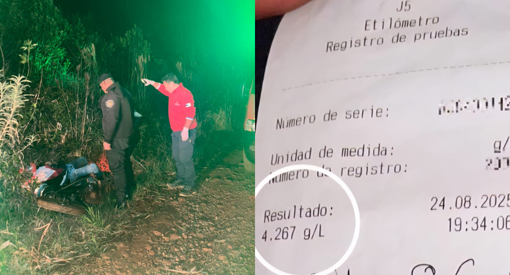 Esta vez, un motociclista imprudente tuvo la “suerte” de no provocar un hecho grave en Apóstoles debido a que estaba muy ebrio para conducir, por ende, despistó, se cayó de la moto y quedó tirado a la vera del camino: tenía 4,26 gramos de alcohol por litro de sangre (g/l), “uno de los registros más altos detectados en la zona”, le atribuyó la Policía de Misiones.