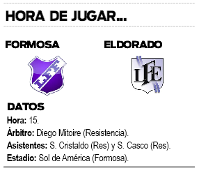 Eldorado viene de adjudicarse la fase provincial y esta es su primera incursión en la presente Copa País fuera de Misiones. De lograr avanzar, jugará la final de la Región Litoral Norte ante el vencedor de Corrientes y Chaco. En la ida la selección correntina se impuso por un categórico 9 a 0 y es casi un hecho el rival en cuestión.