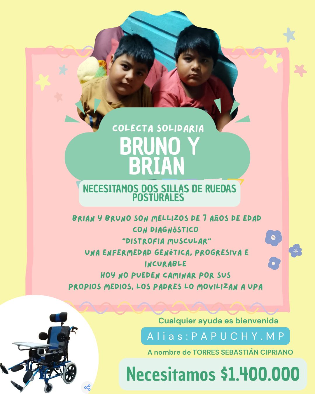 Para poder adquirir las dos sillas, el monto necesario asciende a 1.400.000 pesos. Por eso, los allegados iniciaron una campaña solidaria para reunir el dinero y solicitan la colaboración de la comunidad.
