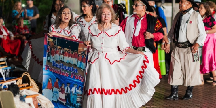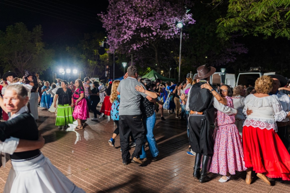La apertura musical estuvo a cargo del conjunto “Son Guaran”, liderado por el acordeonista Sergio Tarnowski, que interpretó el clásico “Regresaré en una flor”, de Los Hermanos Barrios. La danza se hizo presente de inmediato, con parejas de todas las edades ataviadas con trajes gauchescos que animaron la plaza con sus movimientos y alegría.