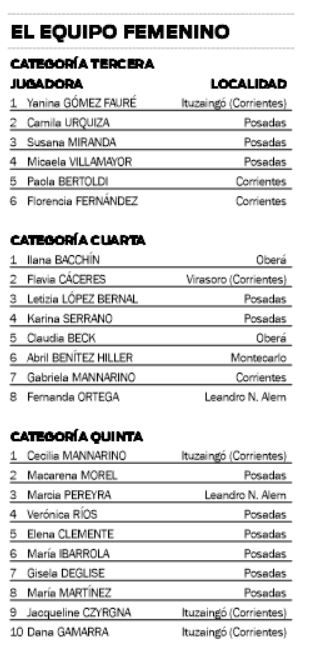 El equipo misionero femenino cuenta con jugadoras de toda la provincia e incluso de las localidades correntinas de Ituzaingó y Virasoro, quienes juegan el Clasificatorio y están federadas por Misiones. Entre todas, se destaca la juvenil Letizia López Bernal, número uno en el ranking nacional Sub-14 y clasificada al Mundial Juvenil que arrancará el 29 de septiembre en España.