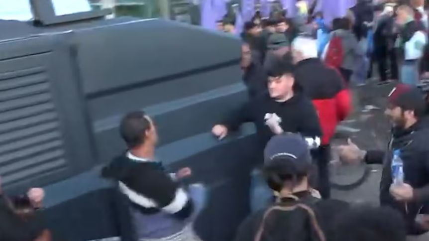 🟣 AHORA | Incidentes entre los manifestantes de la oposición y los militantes libertarios en la previa del acto de campaña de Javier Milei en Moreno, provincia de Buenos Aires.https://t.co/UgSv4IW2UV pic.twitter.com/LhI56LUVvV