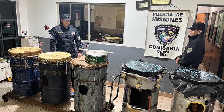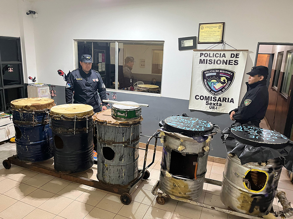 El procedimiento se concretó ayer viernes en horas de la noche, cuando agentes de la Comisaría 6ta visualizaron a varios hombres trasladando tambores y un redoblante por un pasillo interno de la chacra 103 de la capital misionera. Los sujetos, al advertir la presencia policial, se dieron a la fuga abandonando los elementos.