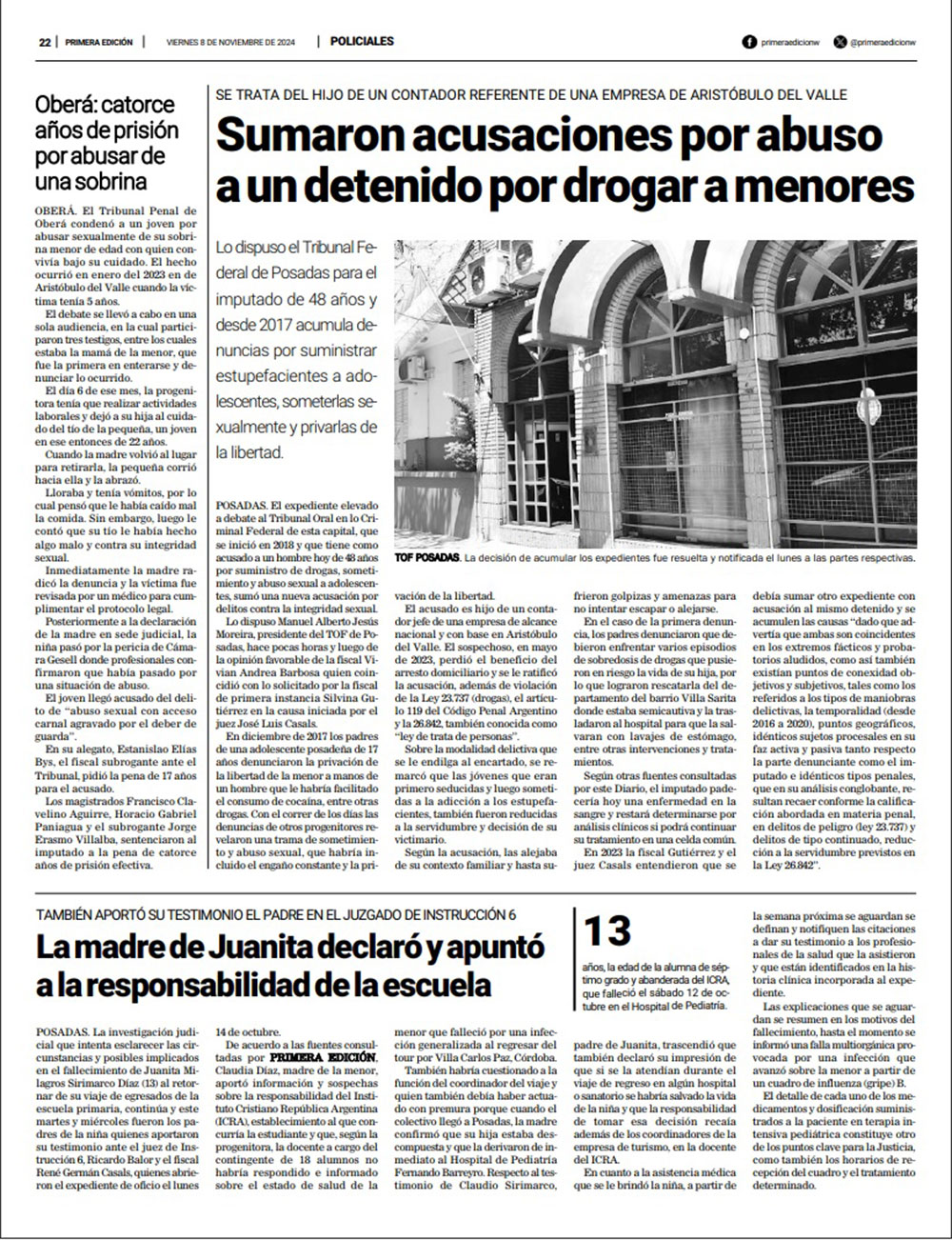 Desde ese momento se destaparon episodios previos de violencia sexual, sometimiento, reducción a la servidumbre, encierro, golpes, drogas sin límites, que incluso se remarcaron desde 2003, cuando el involucrado era un joven estudiante de abogacía en Posadas y proveniente de Aristóbulo del Valle, cuyo padre es contador de una empresa reconocida en todo el país.