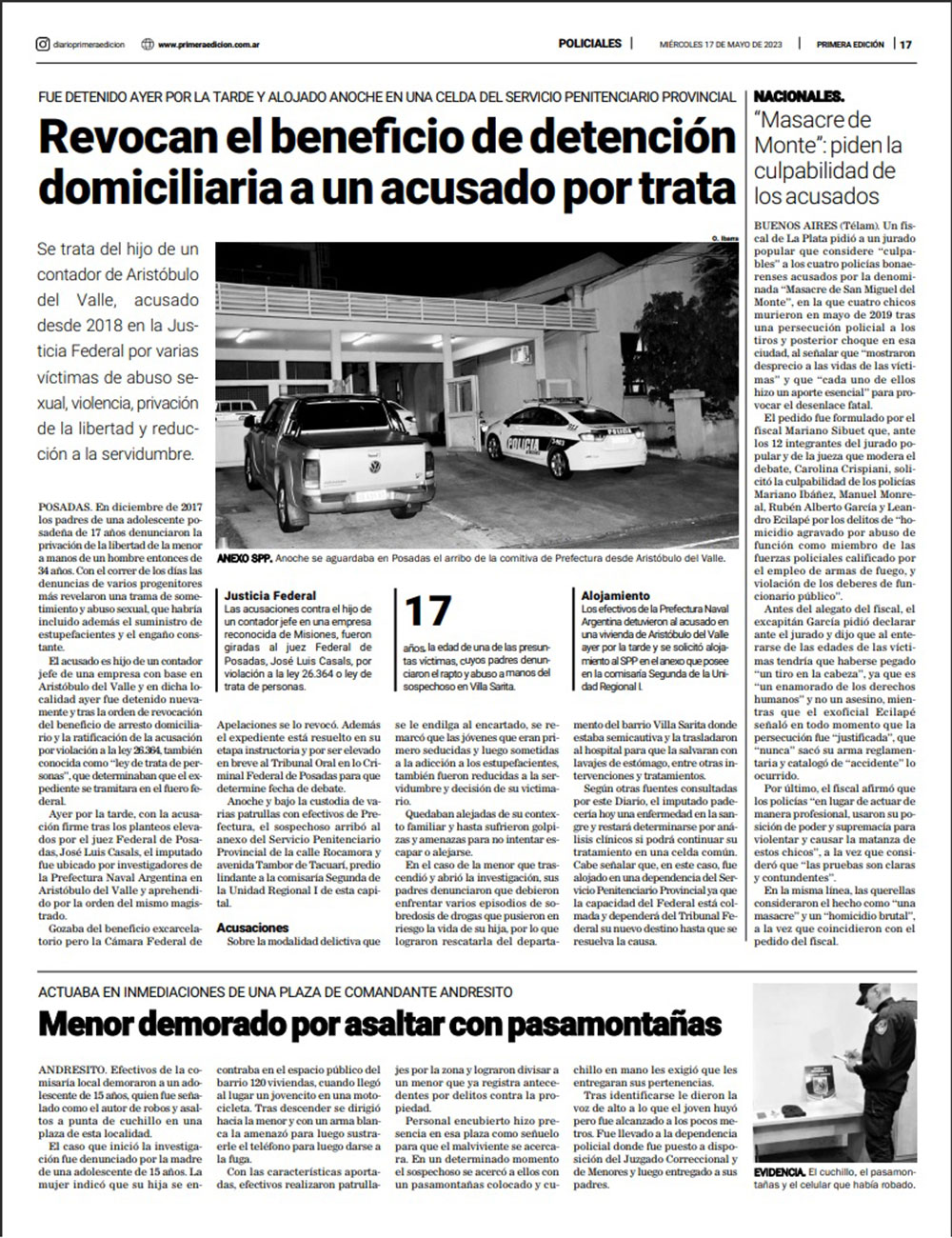 El imputado tiene 41 años y enfrentará desde el próximo miércoles el juicio ante el Tribunal Oral en lo Criminal Federal de Posadas (TOCF) acusado de entregar y suministrar drogas, abusar sexualmente y reducir a la servidumbre al menos a dos menores de edad, una en 2016 cuando tenía 15 años y la restante en 2017 con 17 años.