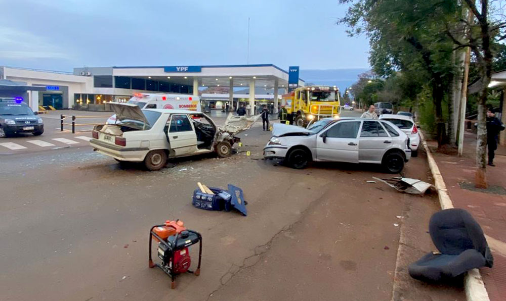 Un fuerte siniestro vial se registró en la madrugada de este domingo, alrededor de las 6.30 horas, en la avenida San Martín casi calle Las Heras de Puerto Rico, cuando un Volkswagen Gol y un Renault 9 colisionaron de manera frontal.