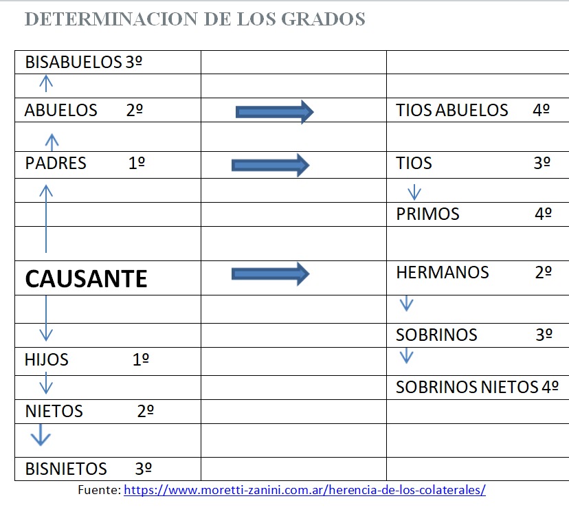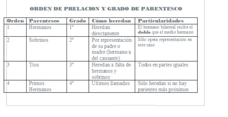 Grados de parentesco: Se hereda hasta el cuarto grado, incluyendo hermanos (segundo grado), sobrinos y tíos (tercer grado), primos, sobrinos nietos y tíos abuelos (cuarto grado).