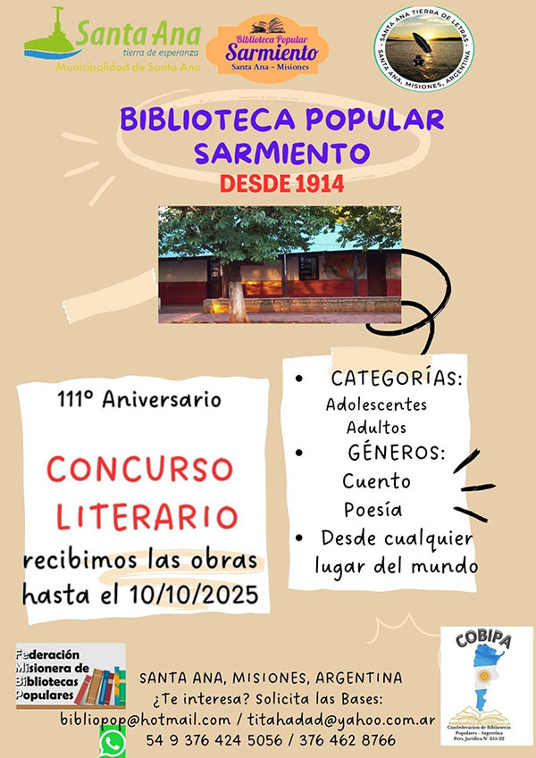 La Biblioteca Popular Sarmiento de Santa Ana, una de las cuatro instituciones centenarias de la provincia, celebra su 111° aniversario con una apuesta audaz: la segunda edición de su concurso literario, abierta a participantes de cualquier lugar del mundo. La iniciativa busca fomentar la lectura y la escritura en un mundo dominado por las pantallas, demostrando que el libro, lejos de morir, sigue siendo un faro cultural.