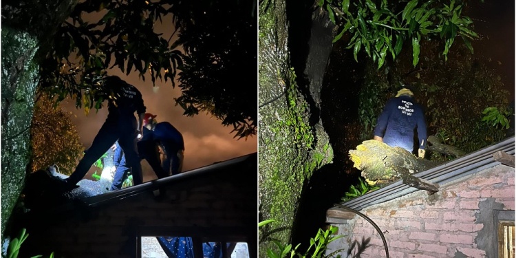 Ante la emergencia, una dotación de la División Bomberos de la Unidad Regional VII se hizo presente rápidamente. Con motosierras, hachas y machetes, trabajaron en la remoción del árbol, cortando el tronco principal y retirando las ramas para despejar completamente la estructura del techo.