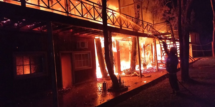 En pocos minutos el fuego consumió durante la madrugada de ayer el complejo turístico de Mojón Grande conocido como Palmar del Río y se investiga el hecho como intencional. El emprendimiento de diez cabañas en la costa del Uruguay es propiedad de Santiago Marino, condenado (juicio abreviado) hace pocos días a cinco años de prisión como cabecilla de una red de contrabando de oleaginosa a Brasil.