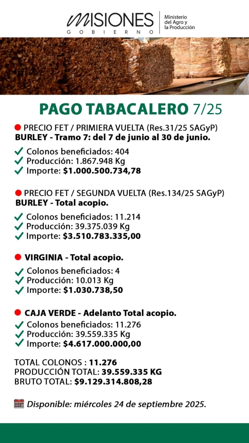 El Gobierno de Misiones, a través del Ministerio del Agro y la Producción, confirmó un nuevo pago a productores tabacaleros en el marco de la Resolución 31/25 del Fondo Especial del Tabaco. El desembolso, correspondiente a la primera vuelta de acopio de tabaco Burley realizada entre el 7 y el 30 de junio, se hará efectivo el miércoles 24 de septiembre y beneficiará a 11.276 colonos de la provincia.
