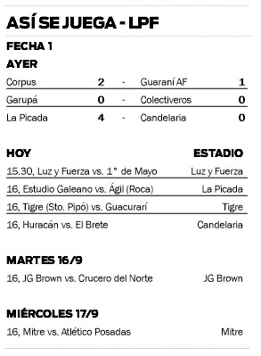 El martes 16 se reanudará la fecha con el choque programado entre Jorge Gibson Brown y Crucero del Norte; en tanto que Bartolomé Mitre será anfitrión de Atlético Posadas el miércoles 17. Ambos juegos serán a las 16.