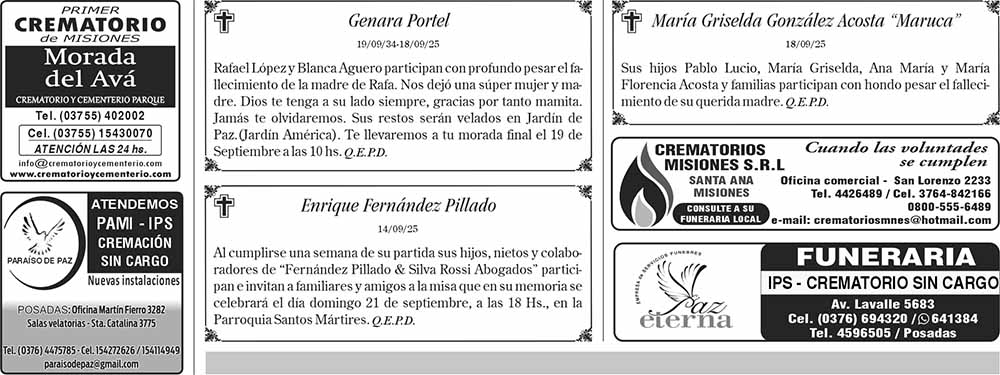 Fúnebres del Viernes 19 de Septiembre de 2025