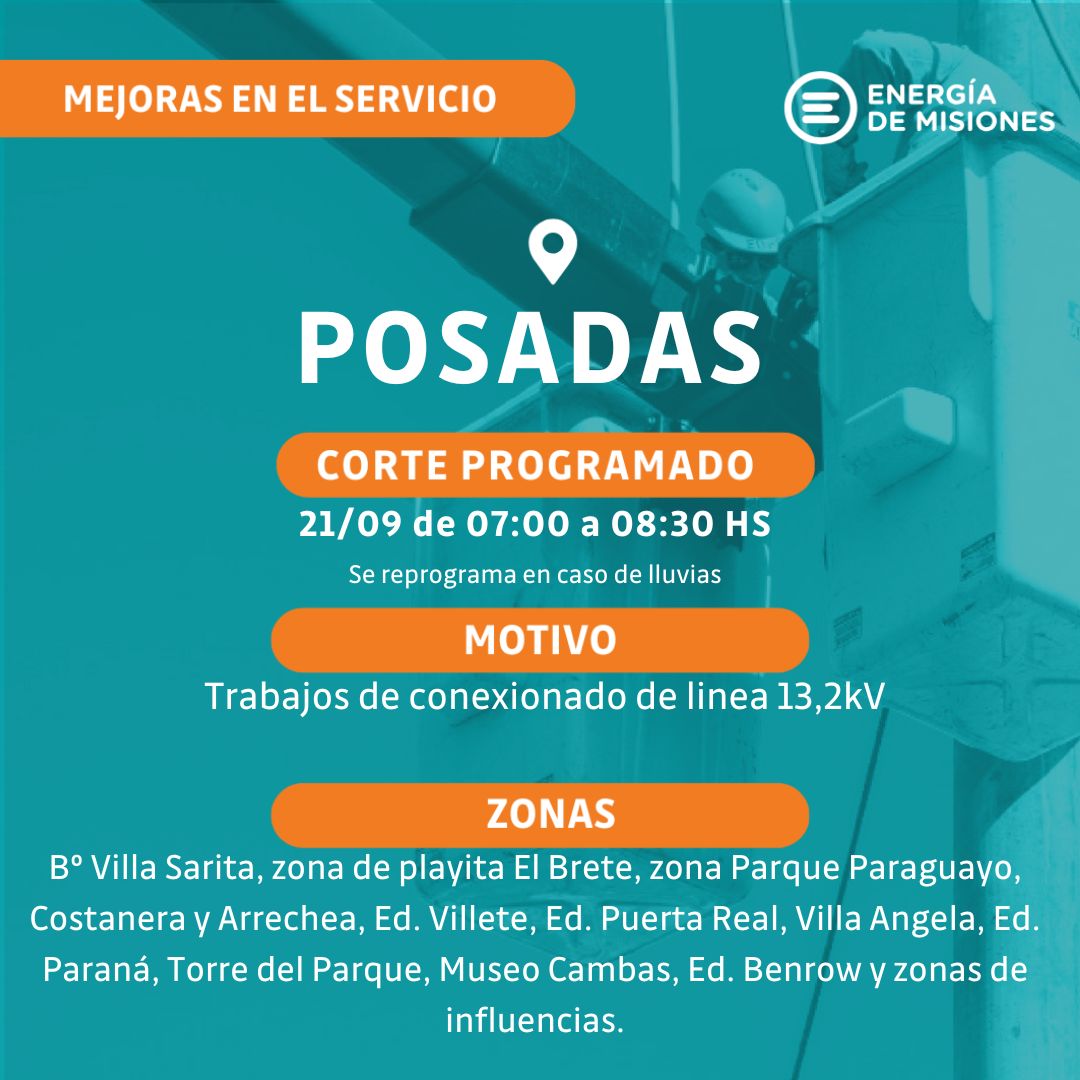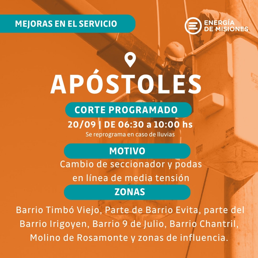 En Apóstoles, el mismo día, el corte se extenderá de 6:30 a 10:00 por el reemplazo de un seccionador y podas en una línea de media tensión. Alcanzará a los barrios Timbó Viejo, parte de Evita, parte de Irigoyen, 9 de Julio, Chantril, Molino de Rosamonte y áreas aledañas.
