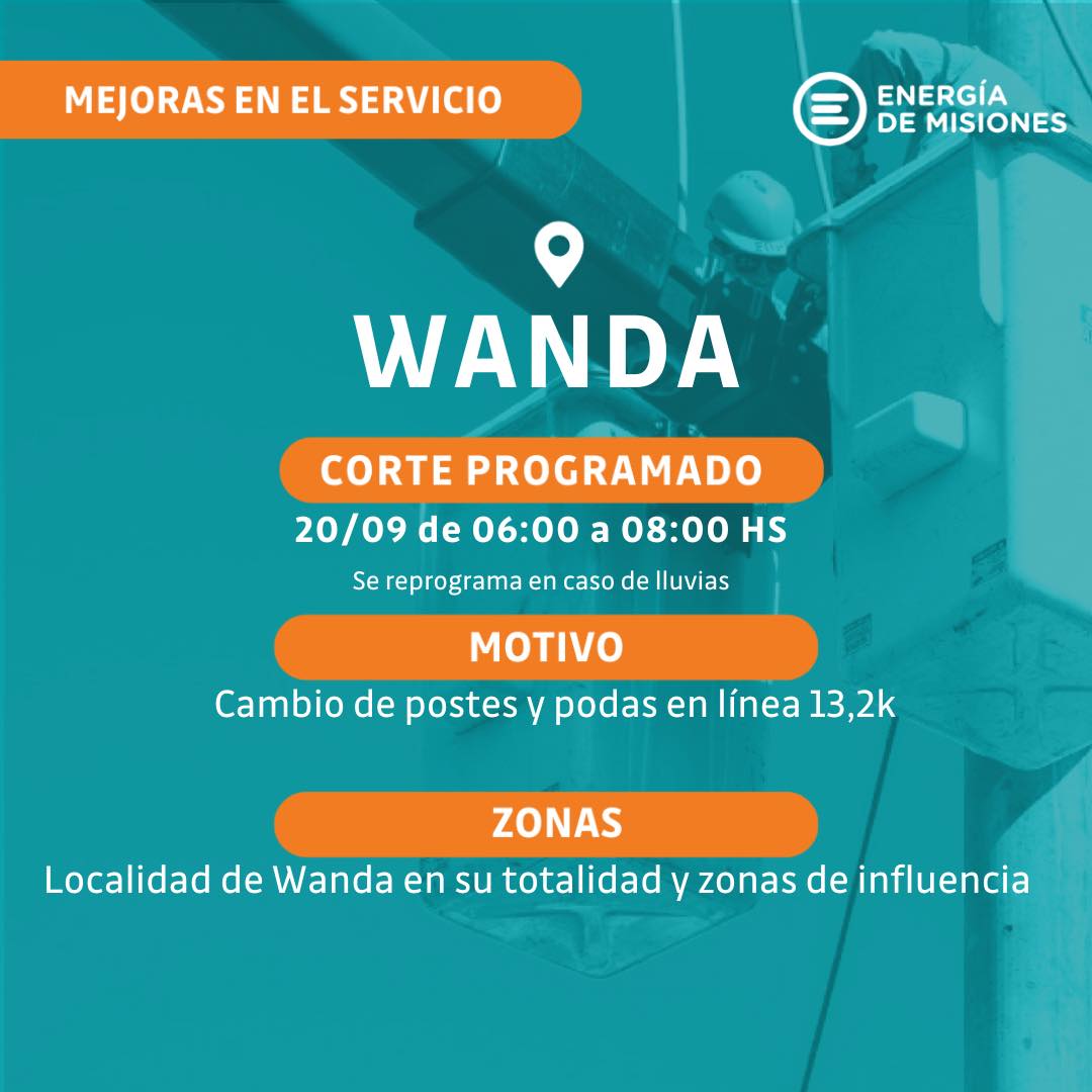 En Wanda, también el sábado, el servicio se interrumpirá de 6:00 a 8:00 por el cambio de postes y trabajos de poda en la línea de 13,2 kV. La suspensión abarcará a toda la localidad y zonas cercanas.