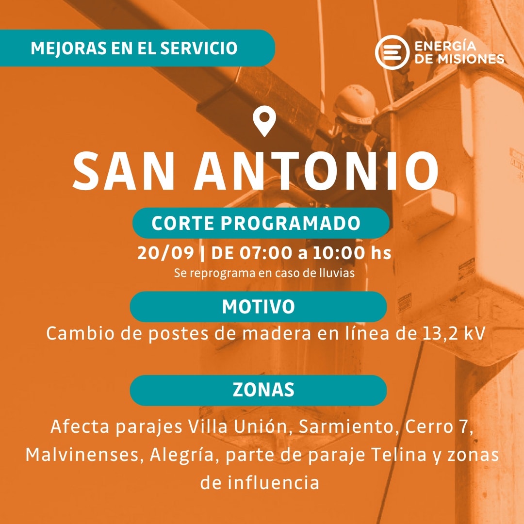 El sábado 20, en San Antonio, la interrupción será de 7:00 a 10:00 debido al cambio de postes de madera en una línea de 13,2 kV. La medida afectará a los parajes Villa Unión, Sarmiento, Cerro 7, Malvinenses, Alegría, parte de Telina y zonas de influencia.