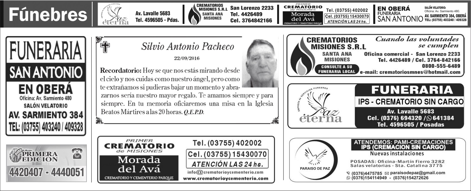 Fúnebres del Lunes 22 de Septiembre de 2025