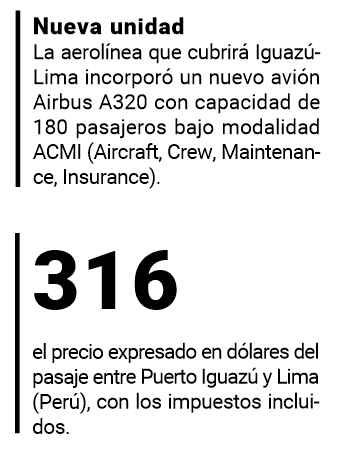 El vuelo inicial será el lunes 1 de diciembre, tal como se había anunciado el pasado 28 de agosto. Unirá Puerto Iguazú con Lima, capital peruana. El pasaje ida y vuelta tiene un costo de 316 dólares con impuestos, por persona.