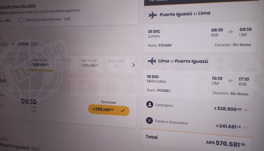 El vuelo inicial será el lunes 1 de diciembre, tal como se había anunciado el pasado 28 de agosto. Unirá Puerto Iguazú con Lima, capital peruana. El pasaje ida y vuelta tiene un costo de 316 dólares con impuestos, por persona.