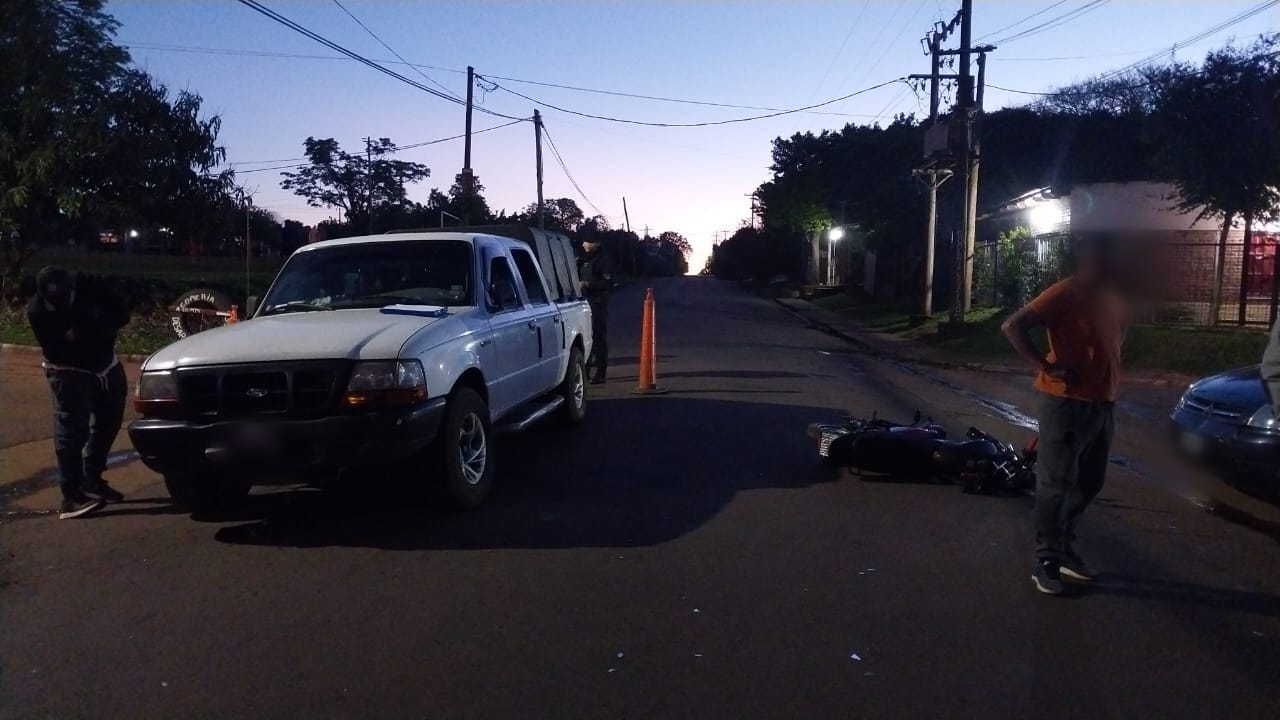 El primer hecho ocurrió a las 17:45 en la intersección de la avenida Alberto Roth y calle Horacio Quiroga, en el barrio Ñu Porá de Garupá. Por causas que son materia de investigación, una camioneta Ford Ranger impactó contra una motocicleta Brava Altino de 150 cc.