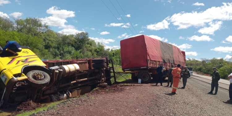 El segundo siniestro se produjo al mediodía sobre la Ruta Nacional 105, a la altura del kilómetro 34, en jurisdicción de San José. Allí, un camión Volvo con acoplado que transportaba yerba mate y circulaba en sentido Posadas–San José despistó de la calzada.