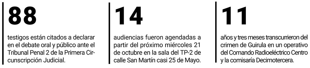 Las partes fueron informadas además por el TP-2 de que las audiencias serán catorce y que 88 testigos fueron citados. Las fechas fijadas (a partir de las 8 cada jornada) son: 21 al 23 y 28 al 30 de octubre; 4 al 6, 11 al 13 y 18 y 19 de noviembre.