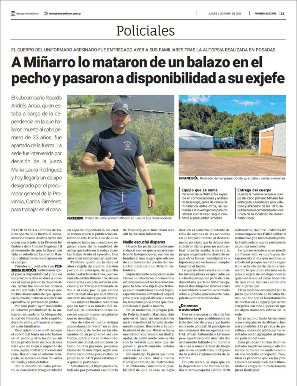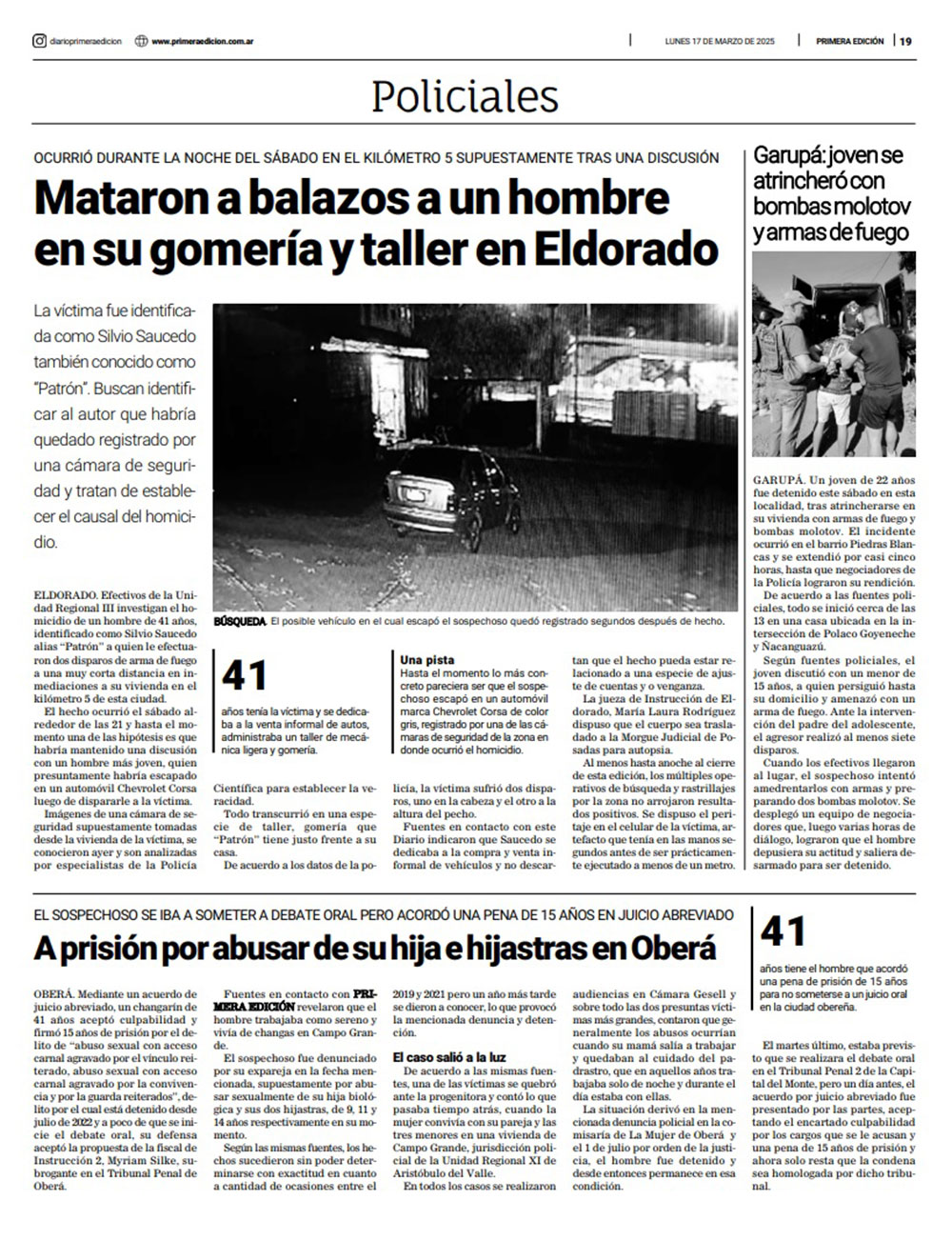 El jefe de la Policía de Misiones, Sandro Alberto Martínez, dialogó ayer con PRIMERA EDICIÓN sobre los últimos avances en la investigación de dos homicidios en Eldorado: el del suboficial de Infantería de la UR-III, Leandro Mauricio Miñarro (30 de diciembre de 2024), y el del gomero y mecánico Silvio “Patrón” Saucedo (15 de marzo de este año).