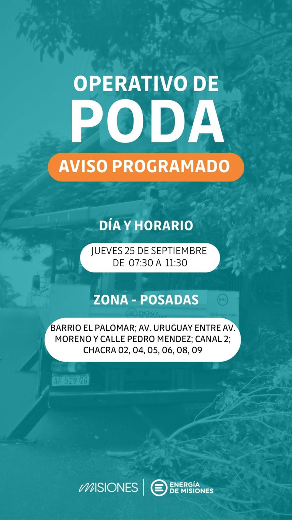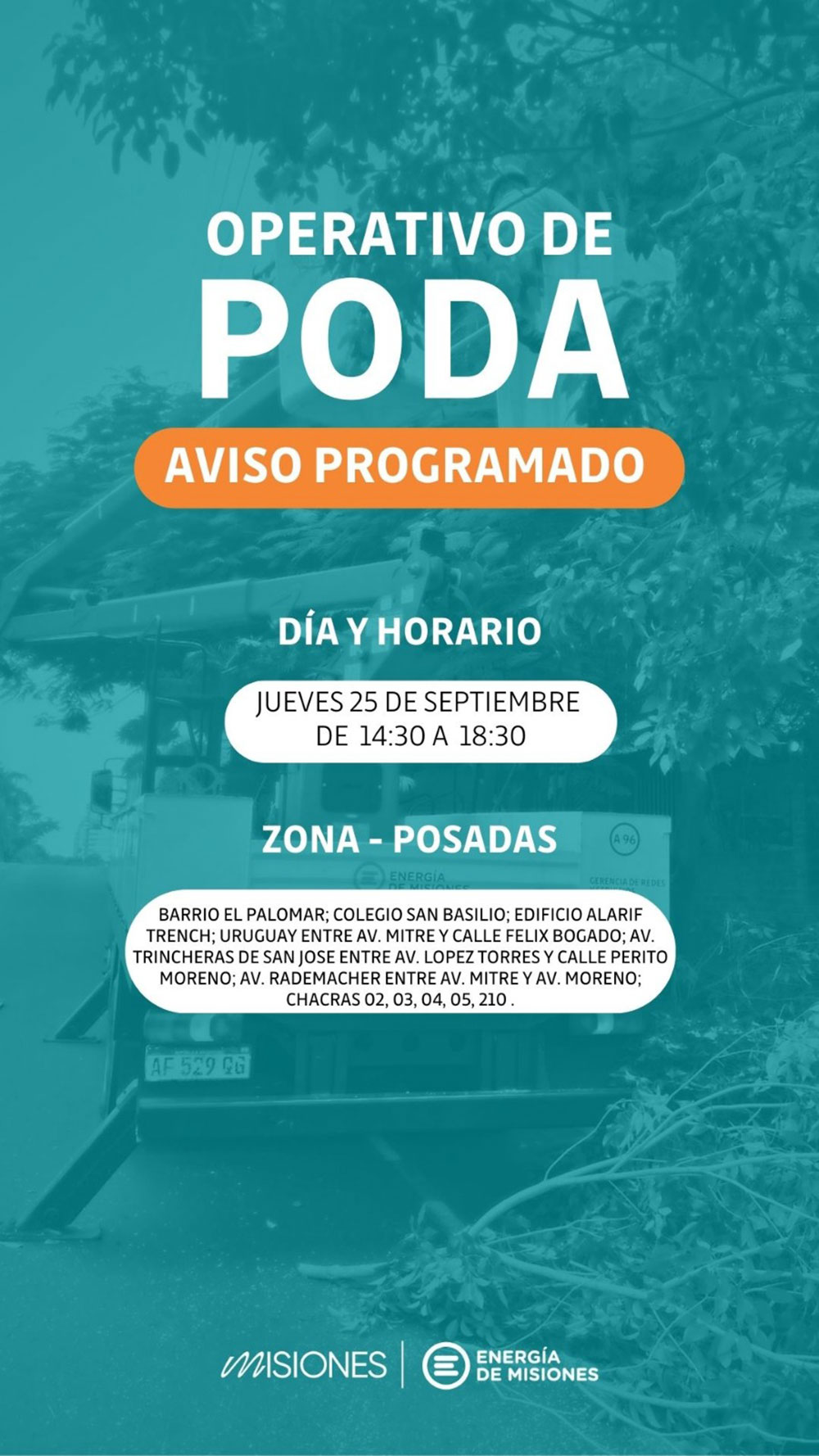 Energía de Misiones SA informó que llevará a cabo un operativo de poda programado para este jueves 25 de septiembre en Posadas, con el objetivo de prevenir caídas de ramas sobre redes eléctricas y garantizar la continuidad del servicio. Los trabajos se desarrollarán en dos turnos diferenciados para minimizar el impacto en los vecinos.