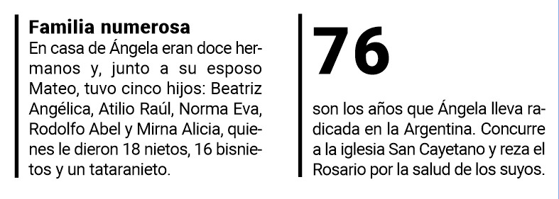 Además de ser una madre “presente y espectacular, de un humor y una memoria admirables”, Ángela era la partera de varios barrios posadeños. “No puedo acordarme porque eran una cantidad, muchos de ellos son mis ahijados, la menor, de seis meses”, sostuvo Ángela que, linterna en mano, la tijera, un hilo velero para atar el cordón, recorría reiteradamente las calles de El Chaquito, Heller, San Cayetano, Villa Coz y Cantera Santa María.
