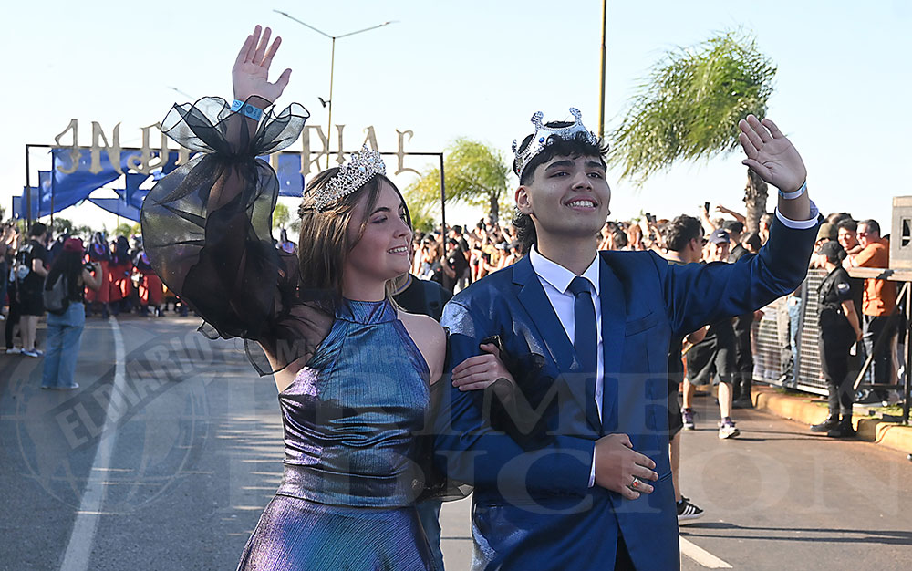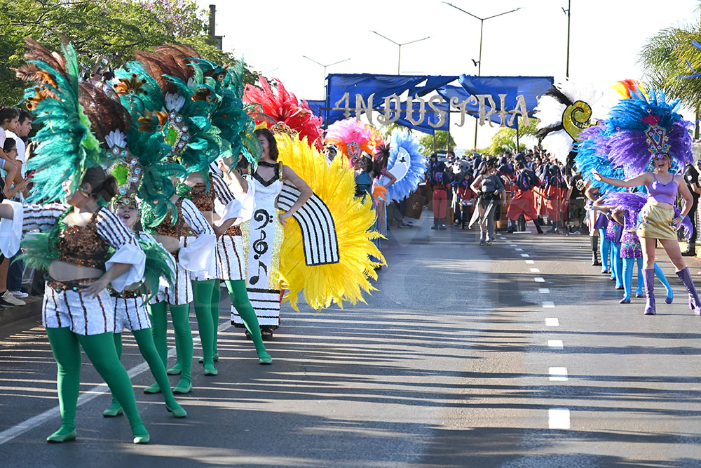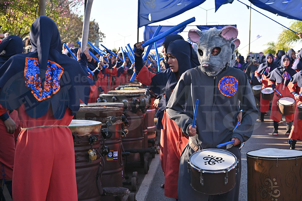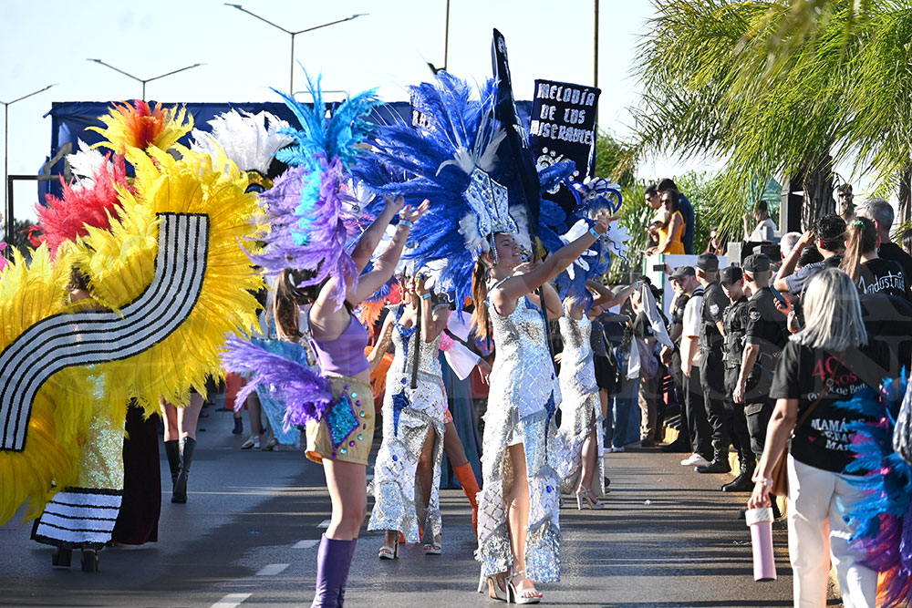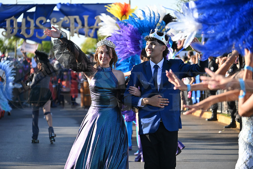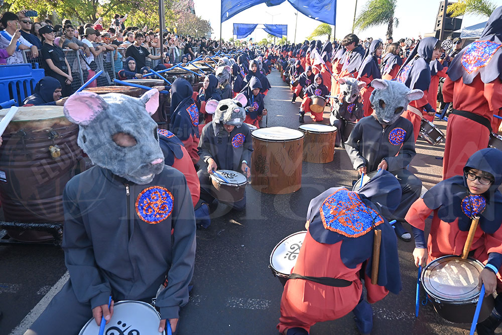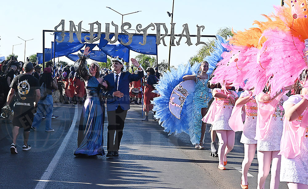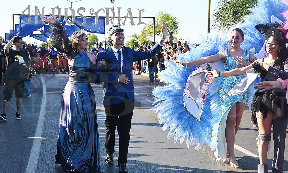A las 17 se levantó el telón con el sonido de los tambores, que encendieron los aplausos y el grito del público para recibir a los alumnos de la “Indu”, que presentaron “La melodía de los Miserables”, una propuesta que promete convertirse en protagonista de esta edición. Fue un gran despliegue de plumas, lentejuelas y ritmo junto a sus soberanos, Ignacio Medina y Nicole Giersztunovicz.