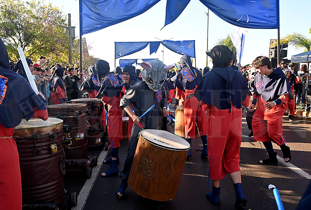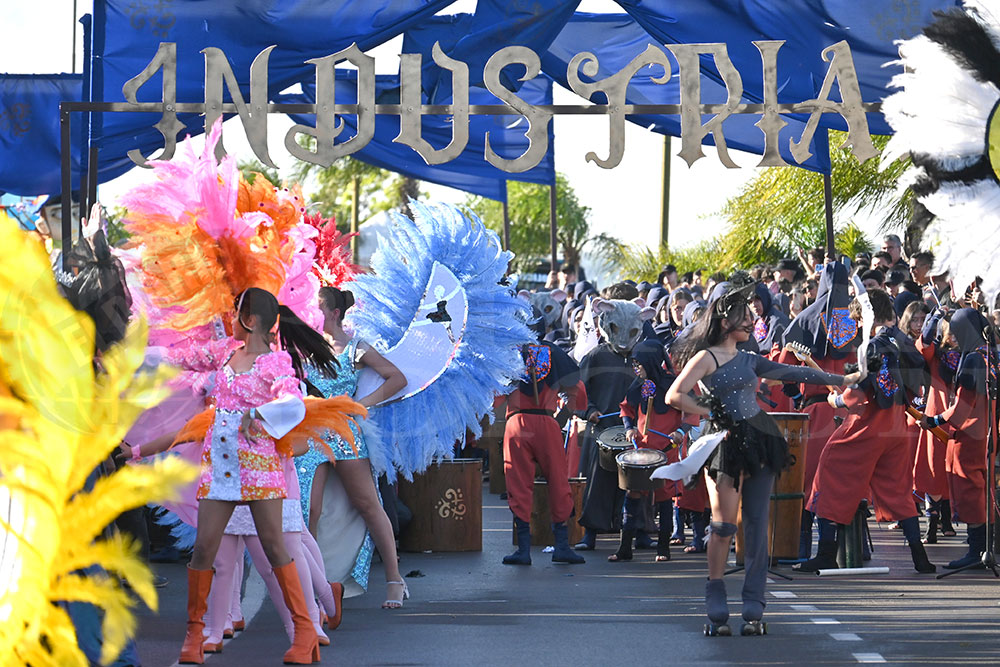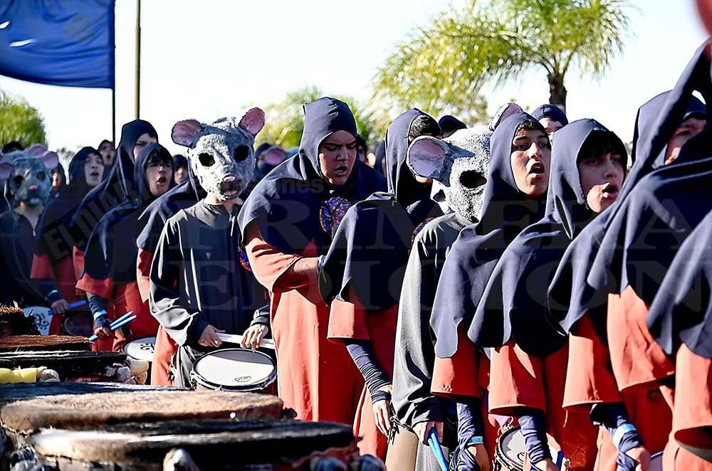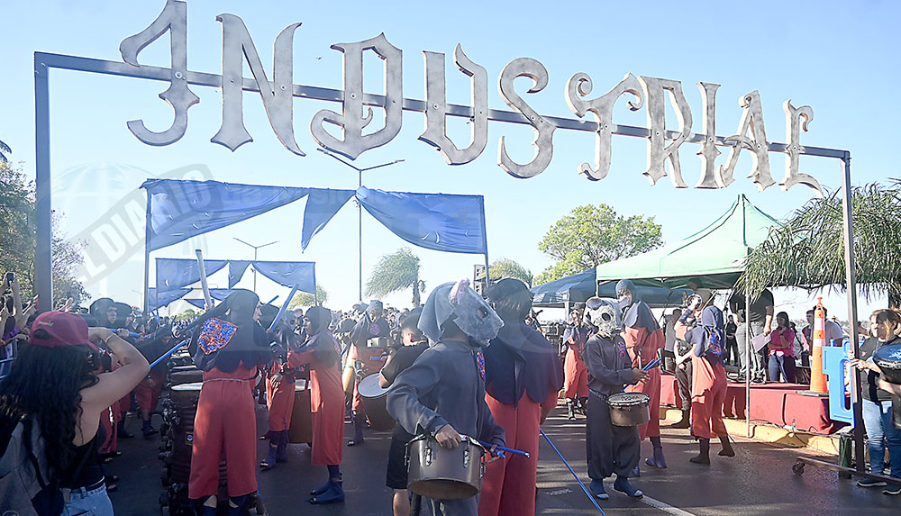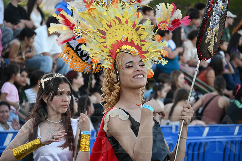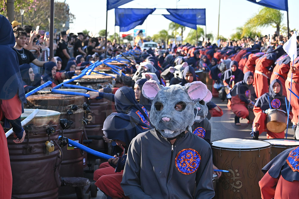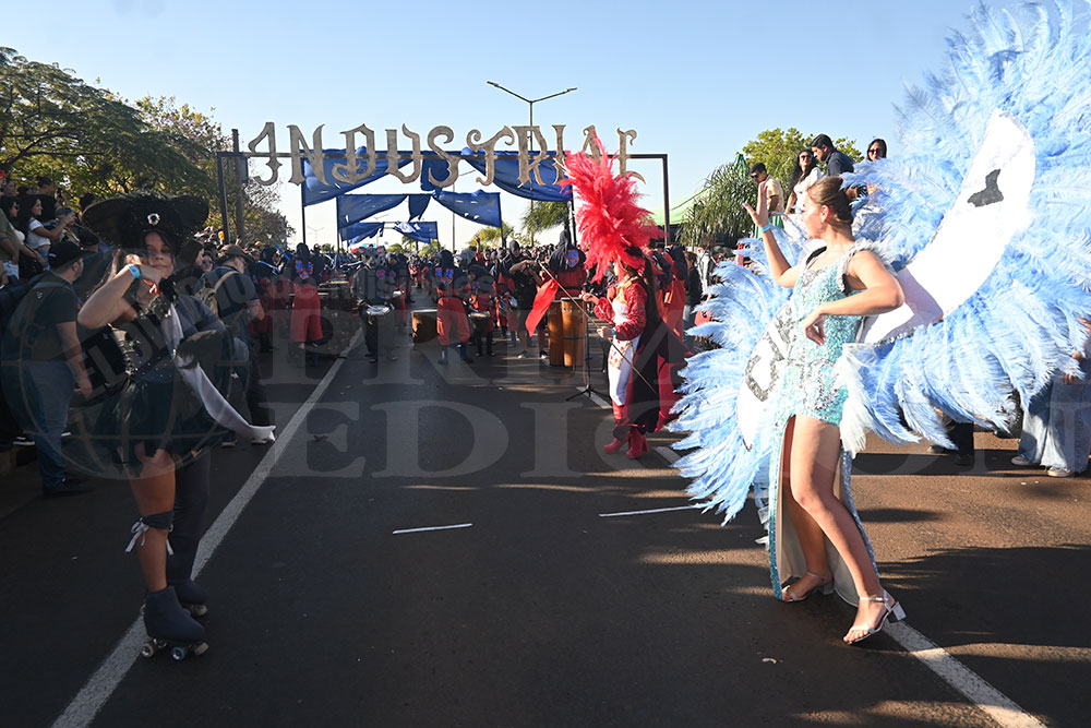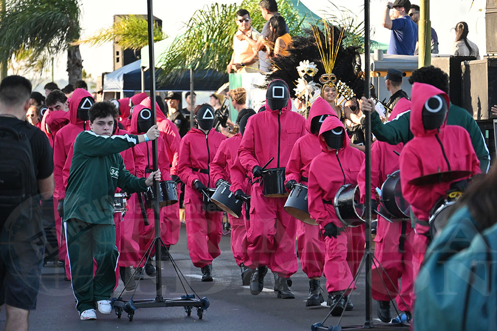 A las 17 se levantó el telón con el sonido de los tambores, que encendieron los aplausos y el grito del público para recibir a los alumnos de la “Indu”, que presentaron “La melodía de los Miserables”, una propuesta que promete convertirse en protagonista de esta edición. Fue un gran despliegue de plumas, lentejuelas y ritmo junto a sus soberanos, Ignacio Medina y Nicole Giersztunovicz.