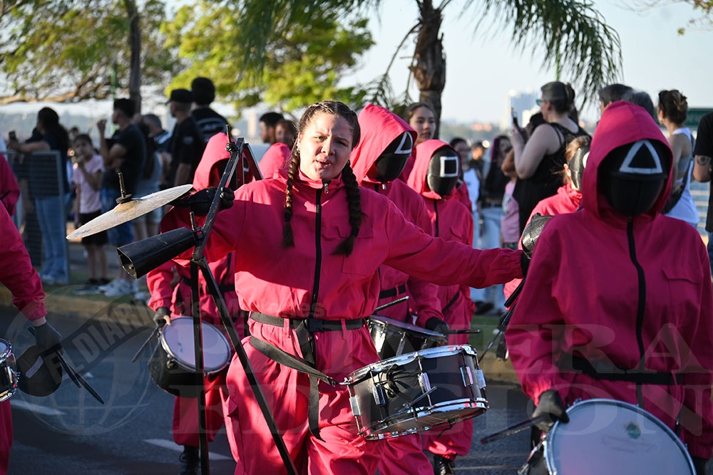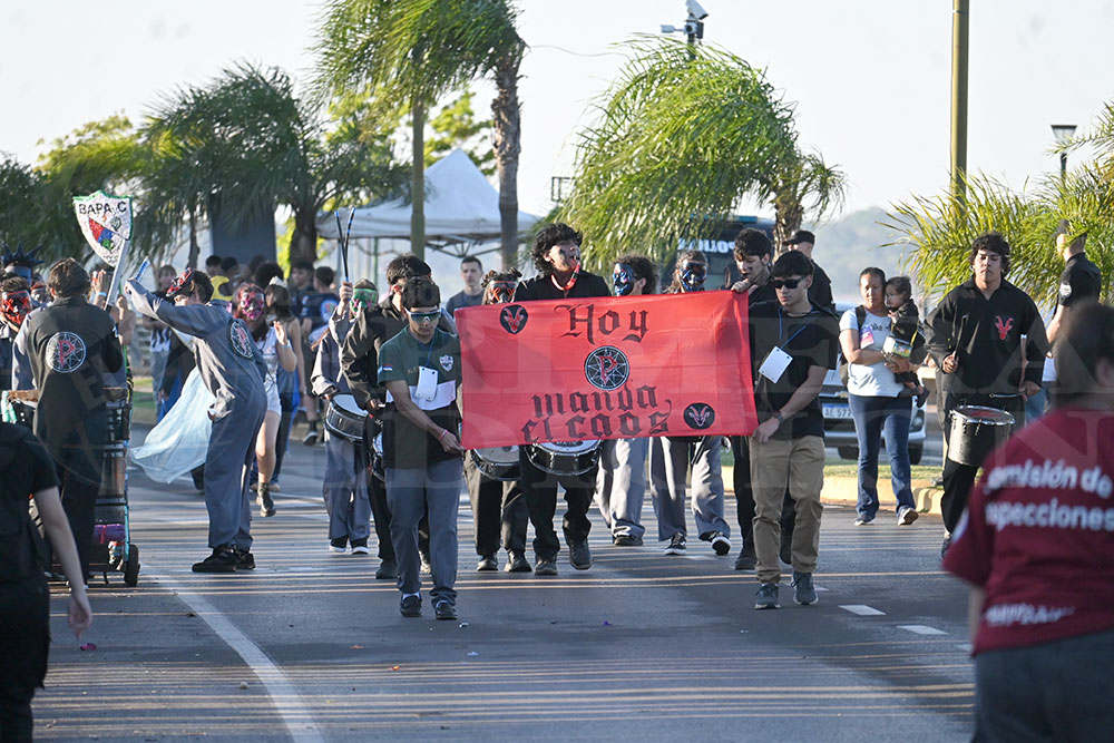 Luego fue el turno del Instituto Jesús Niño, con la consigna “Dualidad de Realidades” y un imponente vestuario que hizo alusión a la popular serie “El Juego del Calamar”, junto al acompañamiento de sus reyes Benjamín Leonel Merlo y Sara Virginia Lukowski Constante. A continuación llegó la presentación del BAPAyC, con sus soberanos Juan Cruz Águila y Anazul Brez, junto a un gran cuerpo de música y baile para mostrar su propuesta denominada “La noche en que se desata el caos”.