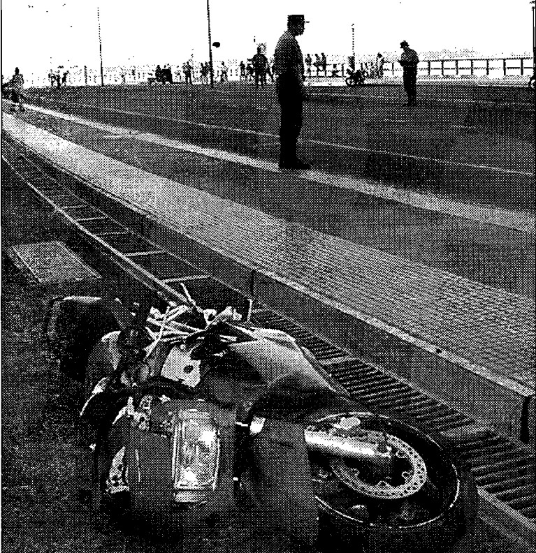 Según los relatos de la época, el motociclista no llevaba casco, pero sí dejó diseminados por su camino -además de las huellas de frenada sobre el pavimento- sus zapatos, unos anteojos oscuros, latas de cerveza retorcidas y pedazos de la moto.