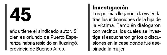 Ayer pudo completarse la autopsia a Irene Elvira Medina (61), quien fue encontrada asesinada entre la noche del viernes y la madrugada del sábado en la localidad de Puerto Esperanza. Quedó confirmado que murió a causa de una golpiza por la cual se encuentra detenido un sospechoso.