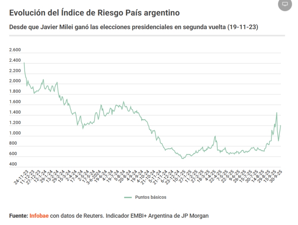 En tanto, el riesgo país, medido por el índice de JP Morgan, sube 89 unidades y alcanza los 1.204 puntos básicos, reflejo del deterioro en la percepción de riesgo sobre la deuda argentina.
