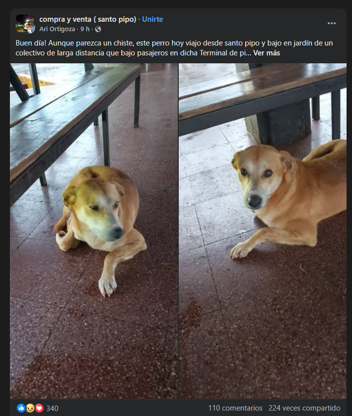 El hecho ocurrió este martes 30 de septiembre y se viralizó rápidamente en redes sociales. Una usuaria publicó fotos del animal en un grupo de compra y venta con el siguiente mensaje: “Buen día! Aunque parezca un chiste, este perro hoy viajó desde Santo Pipó y bajó en Jardín de un colectivo de larga distancia. Si tiene dueño y lo están buscando, está en la terminal de Jardín América”.